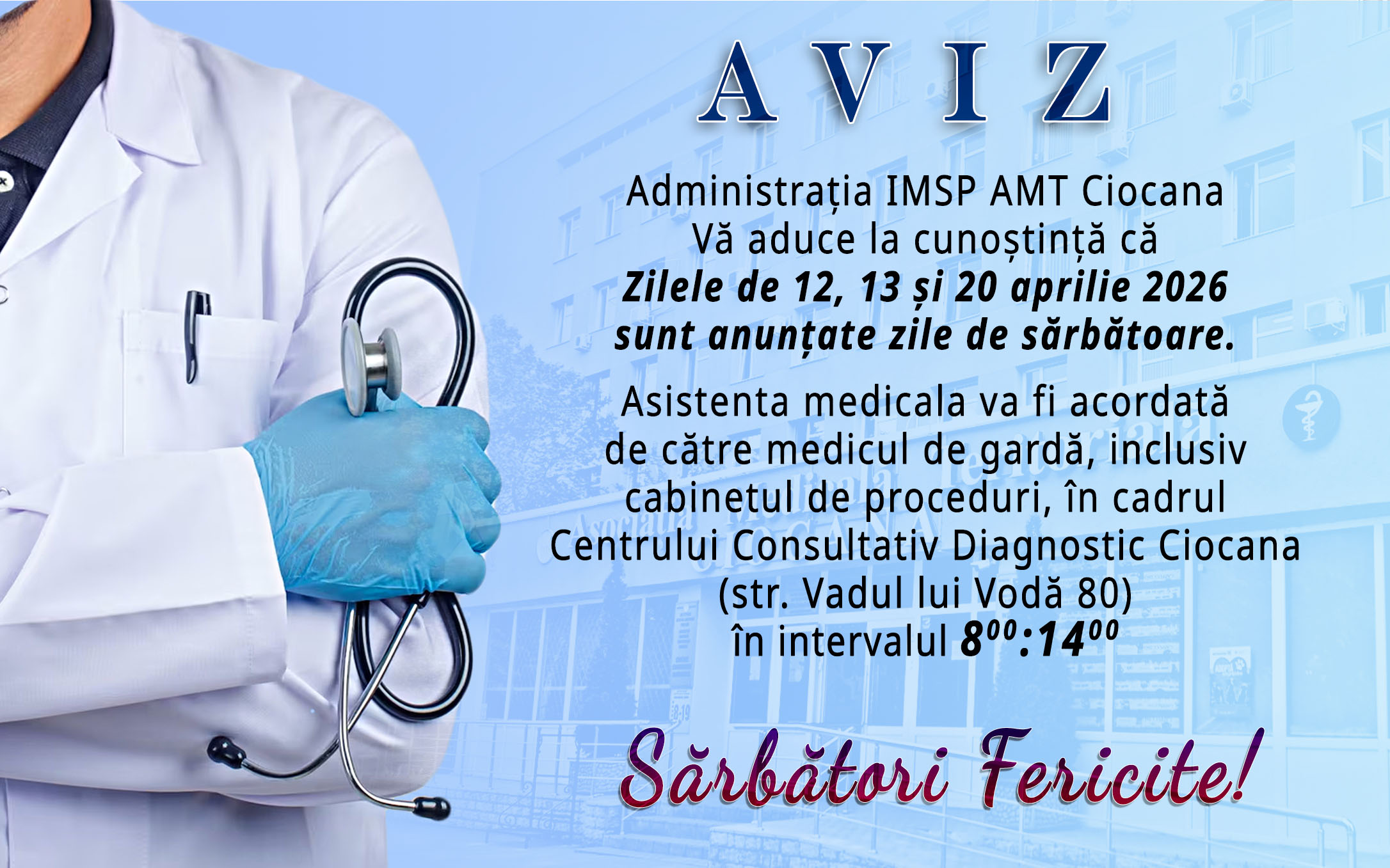 • Administrația IMSP AMT Ciocana Vă informează, că din 02 ianuarie 2026, asistența medicală antirabică, pentru locuitorii sectorului Ciocana, va fi acordată în cadrul Centrului Medicilor de Familie nr.8, str.Voluntarilor 3, biroul 105.