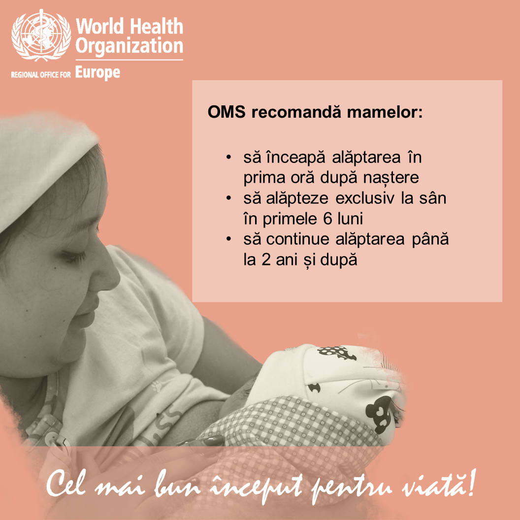 Organizația Mondială a Sănătății (OMS) și UNICEF recomandă alăptarea exclusivă a copilului până la 6 luni, şi continuarea acesteia, cu introducerea treptată a alimentaţiei complimentare până la doi ani şi mai mult.