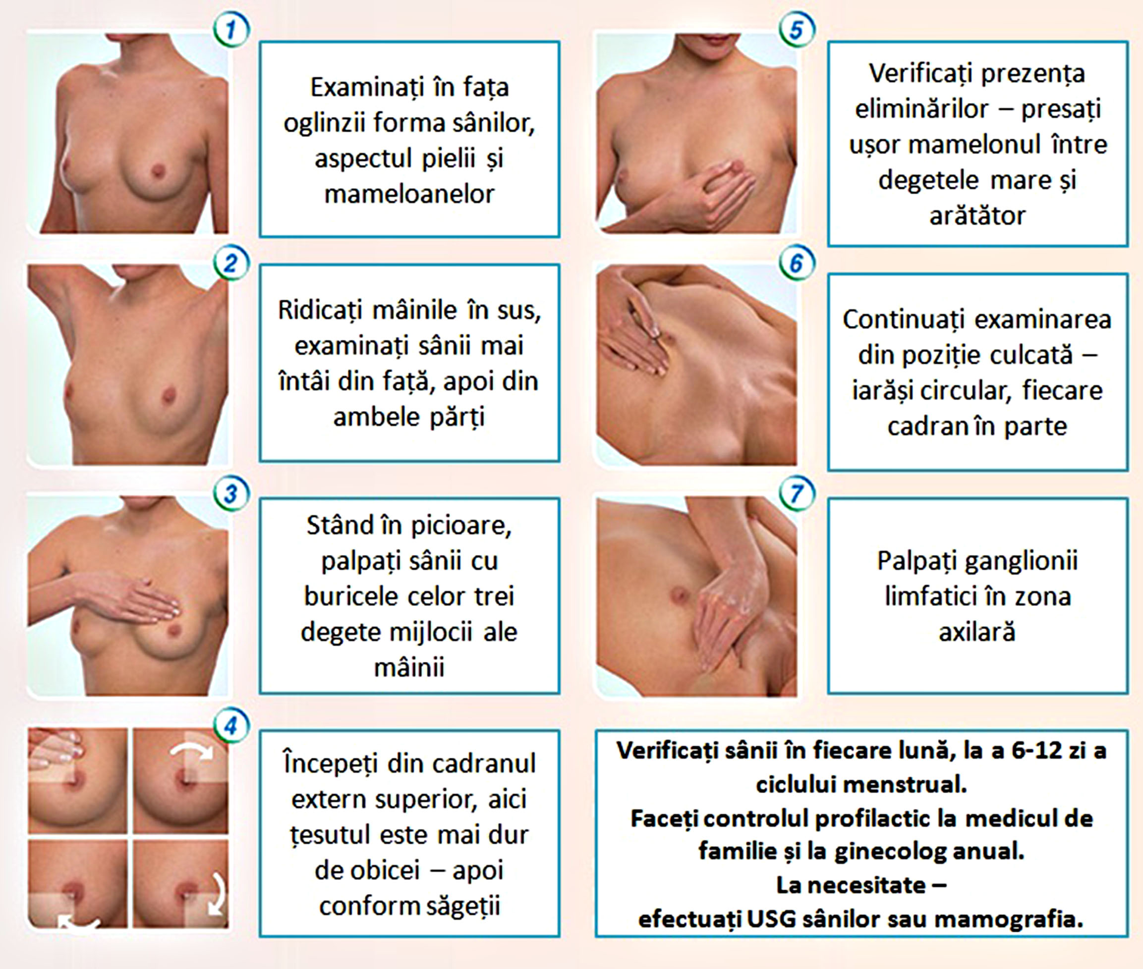 Medicii recomandă ca fiecare femeie să-şi palpeze sânii în fiecare lună, la trei-patru zile după terminarea ciclului menstrual sau cu 7 zile înainte de începerea ciclului menstrual