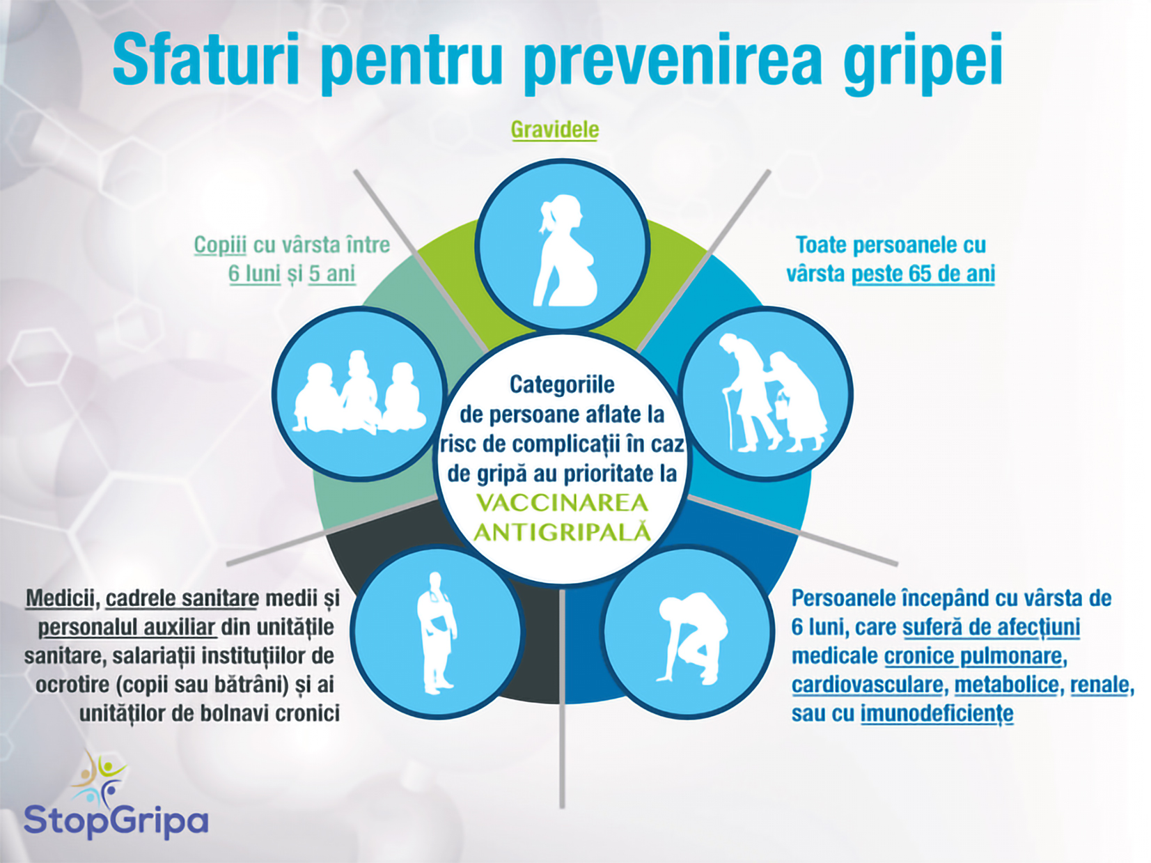Vaccinul antigripal este recomandat tuturor persoanelor, incepand cu varsta de 6 luni. Vaccinarea persoanelor cu risc ridicat este deosebit de importanta pentru a reducerea riscului apariţiei formelor severe de boală.