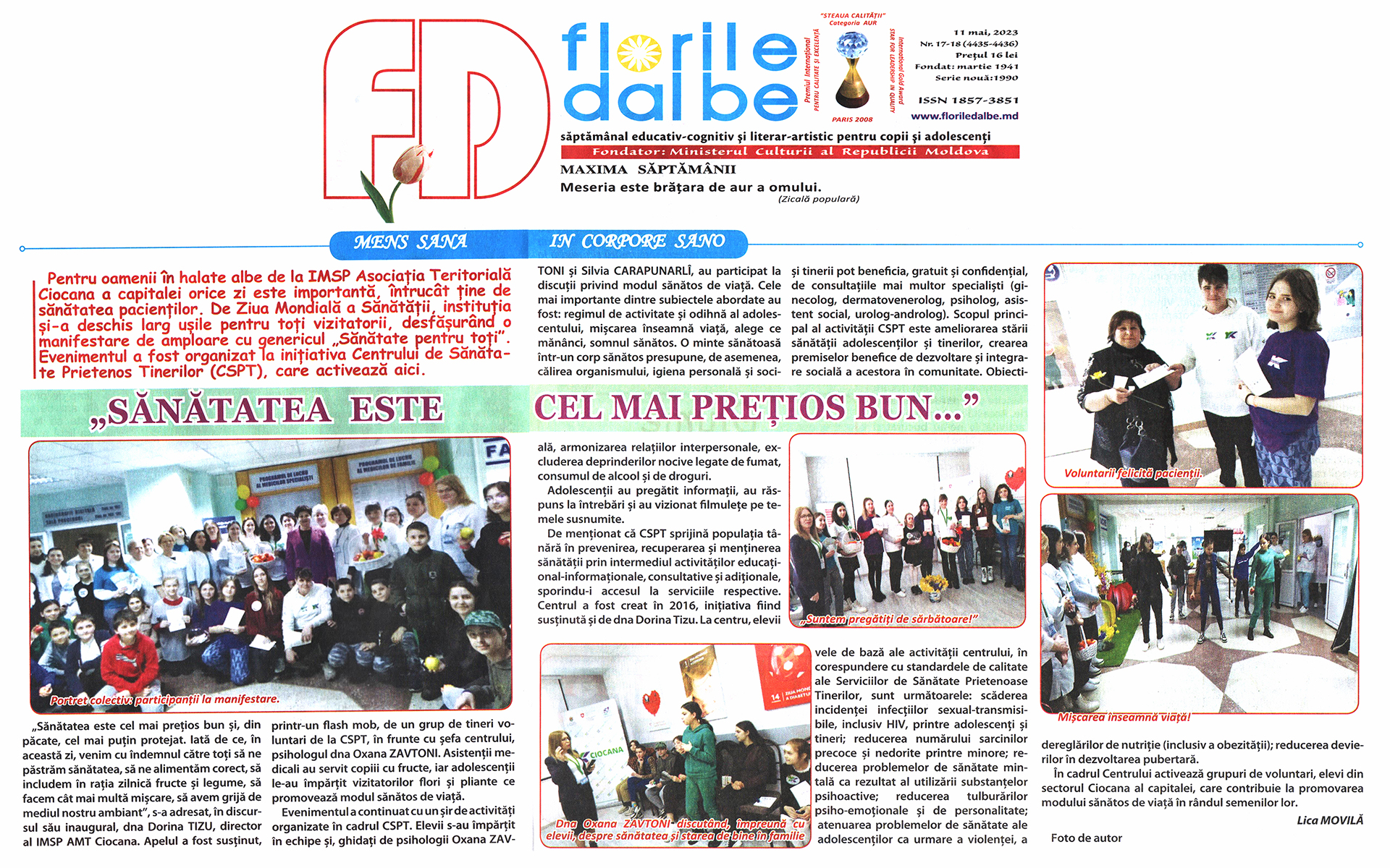 Articolul publicat în revista Florile Dalbe din 11.05.2023, reflectă activitățile IMSP Asociația Medicală Teritorială Ciocana în comun cu voluntarii Centrului de Sănătate Prietenos Tinerilor.