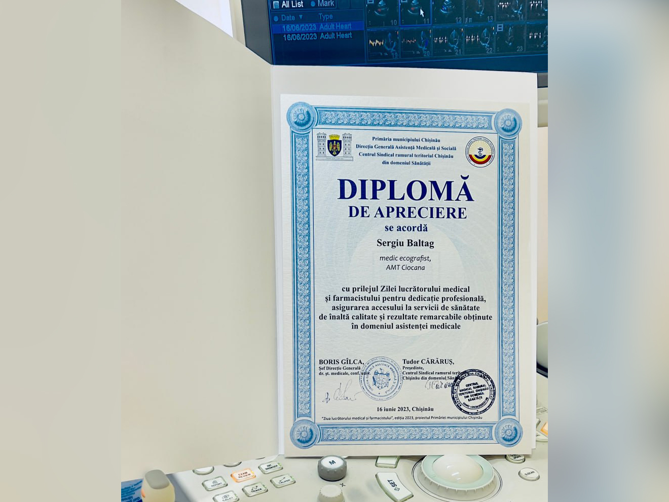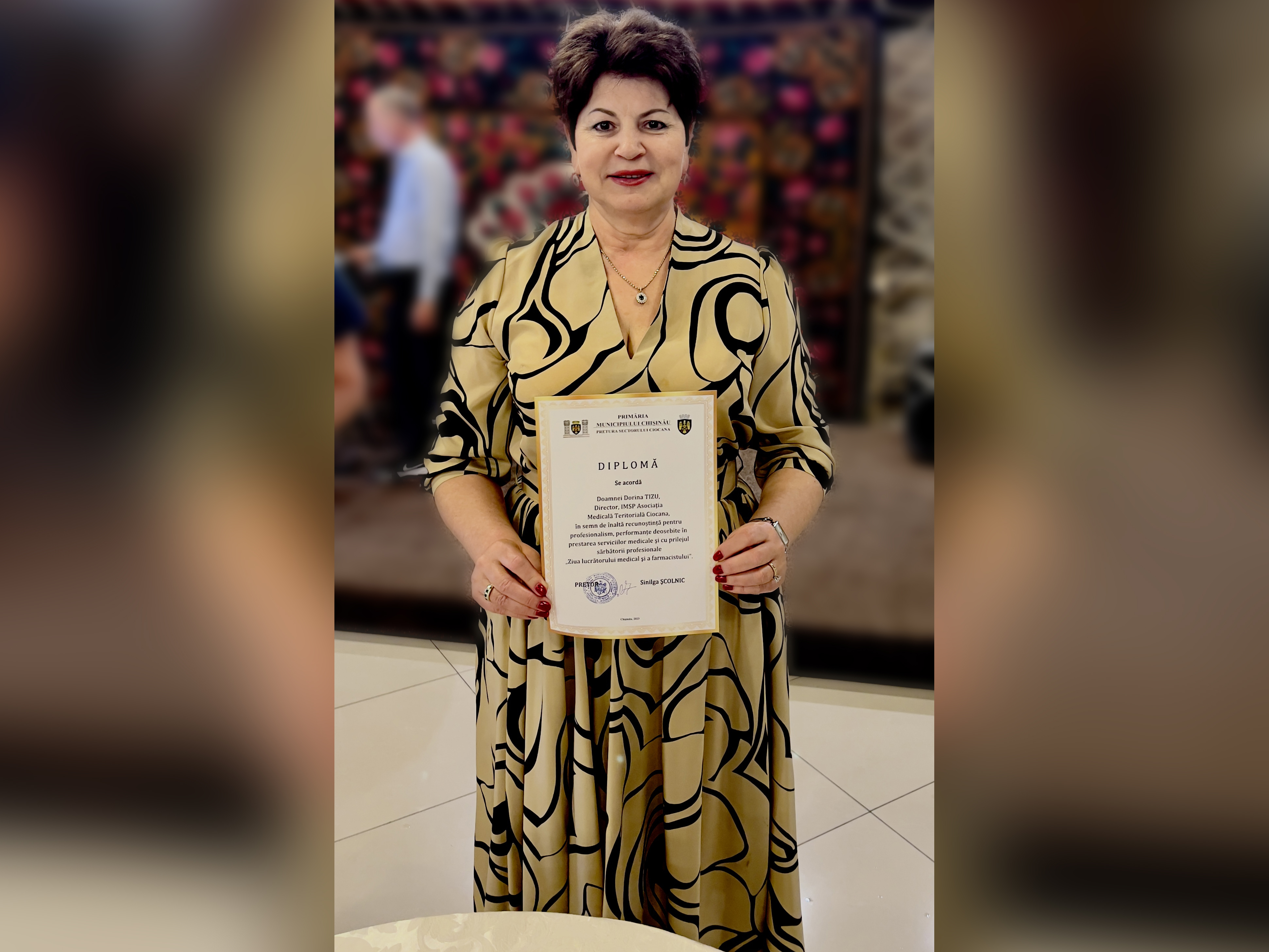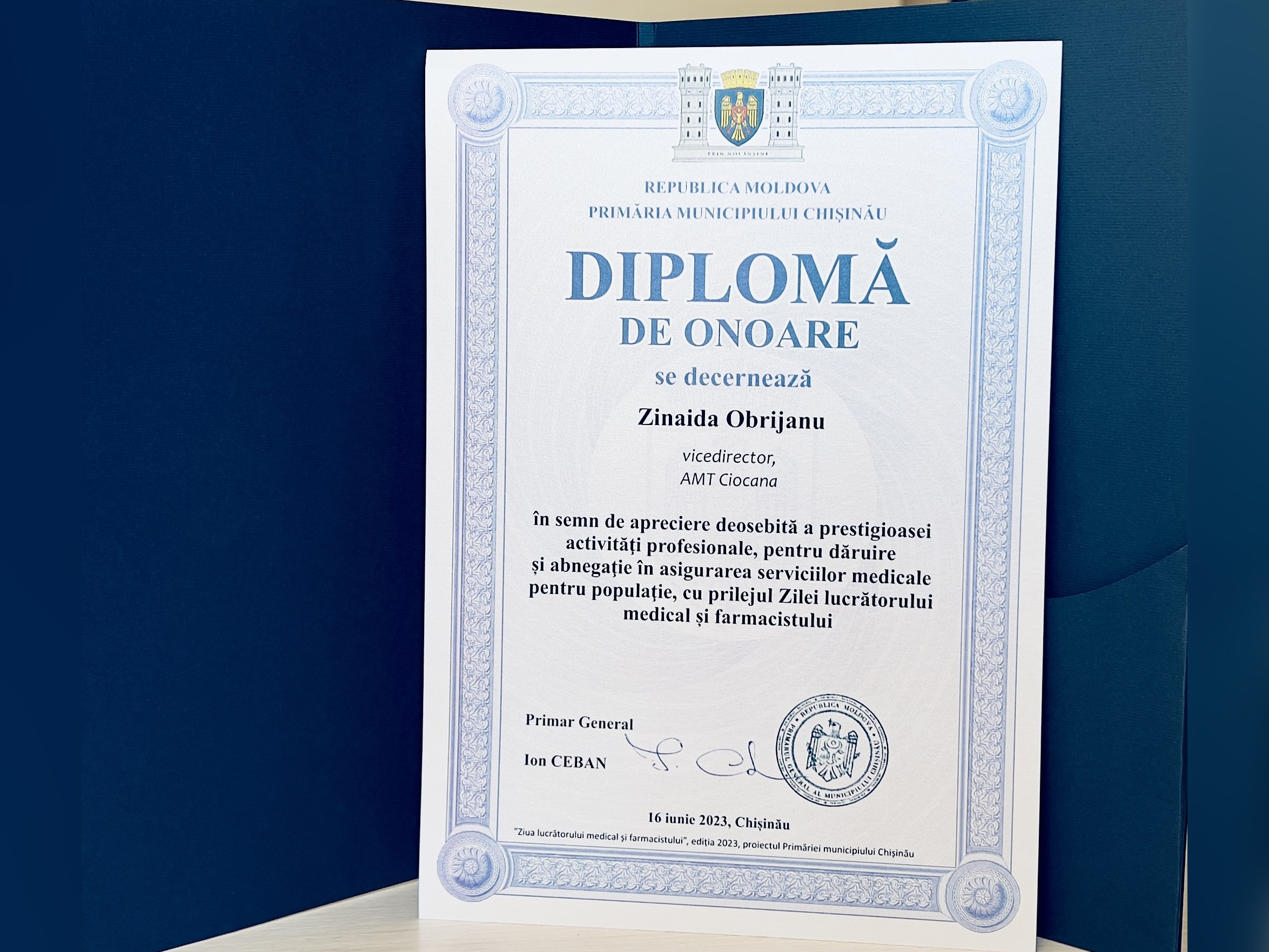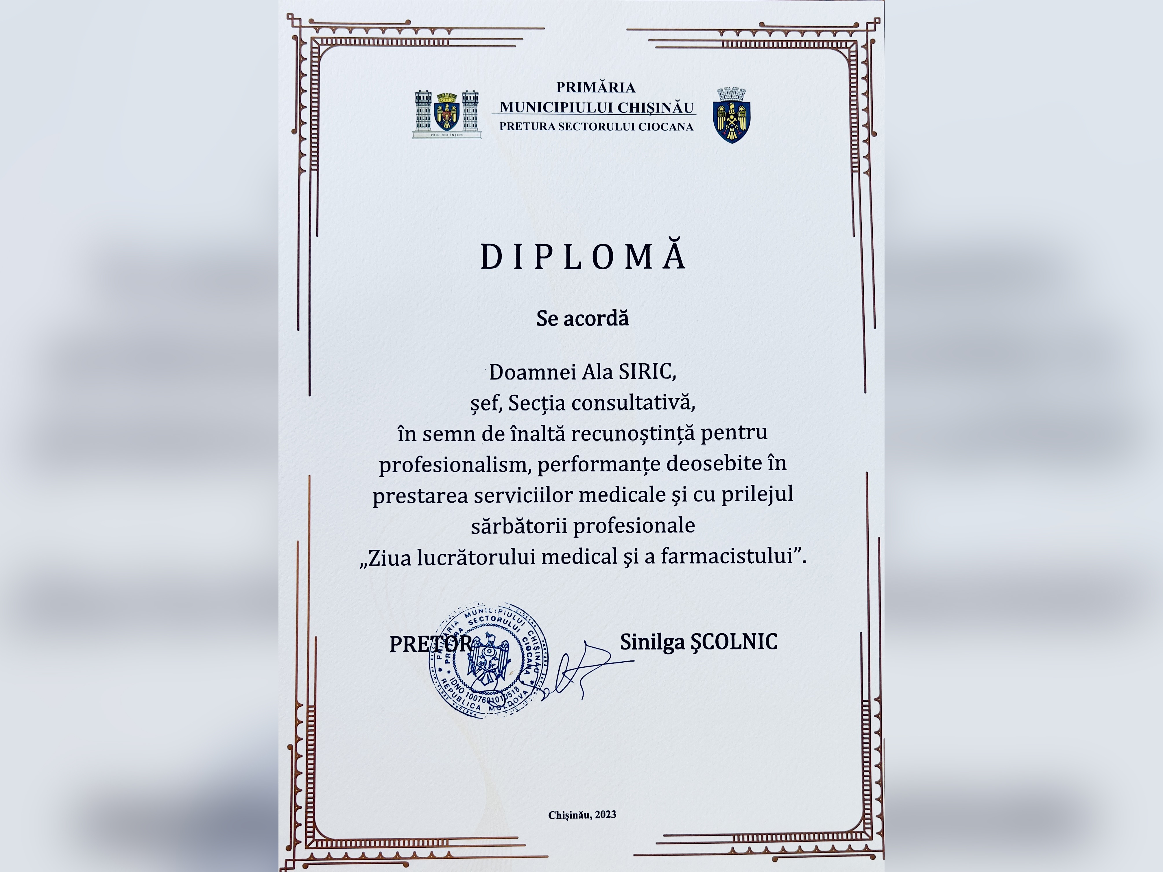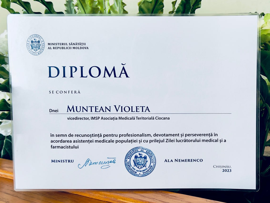 În semn de apreciere deosebită a prestigioasei activități profesionale, subdiviziunile și colaboratorii instituției sunt decernați cu Diplome de Onoare din partea dlui Ion CEBAN, Primar General al municipiului Chișinău; dlui Boris GÎLCA, șef Direcția Generală Asistență Medicală și Socială; dna Sinilga ȘCOLNIC, Pretor sectorul Ciocana; dna Dorina TIZU director IMSP Asociația Medicală Teritorială Ciocana.