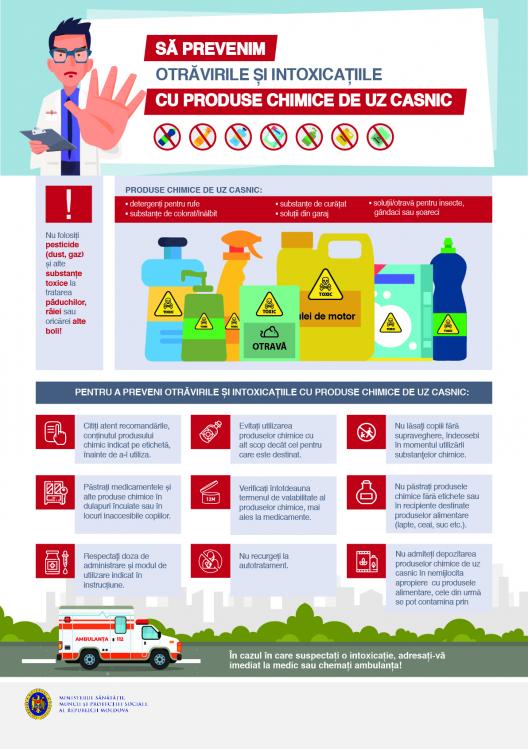 Pentru a sensibiliza populaţia şi a face părinţii să conştientizeze pericolul otrăvirilor cu substanțe chimice, mai ales în condiţii casnice, specialiștii Agenției Naționale pentru Sănătate Publică, în comun cu șefii Direcțiilor de învățământ teritoriale și medicilor de familie, conducătorii Instituțiilor Medico-Sanitare Publice şi cadrelor didactice vor desfăşura activităţi de informare şi comunicare pe tematica prevenirii intoxicațiilor și protecției sănătății de acțiunea diferitor substanțe chimice.