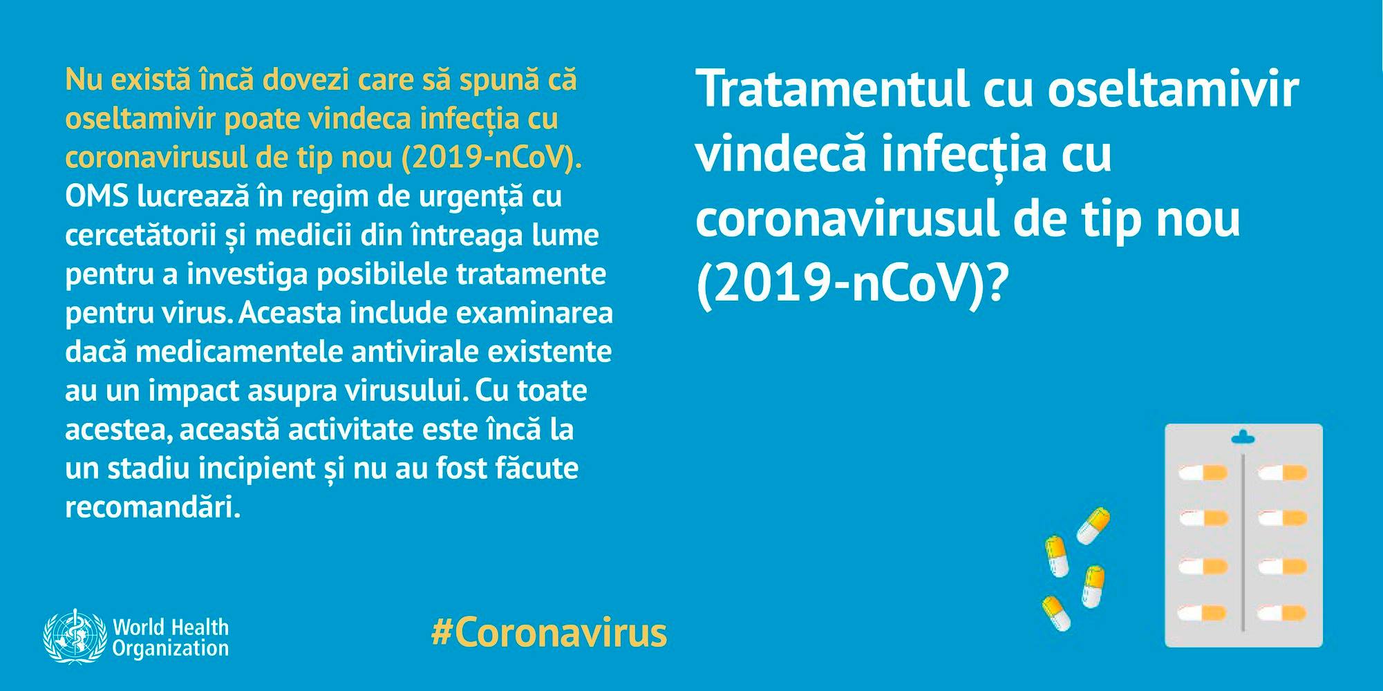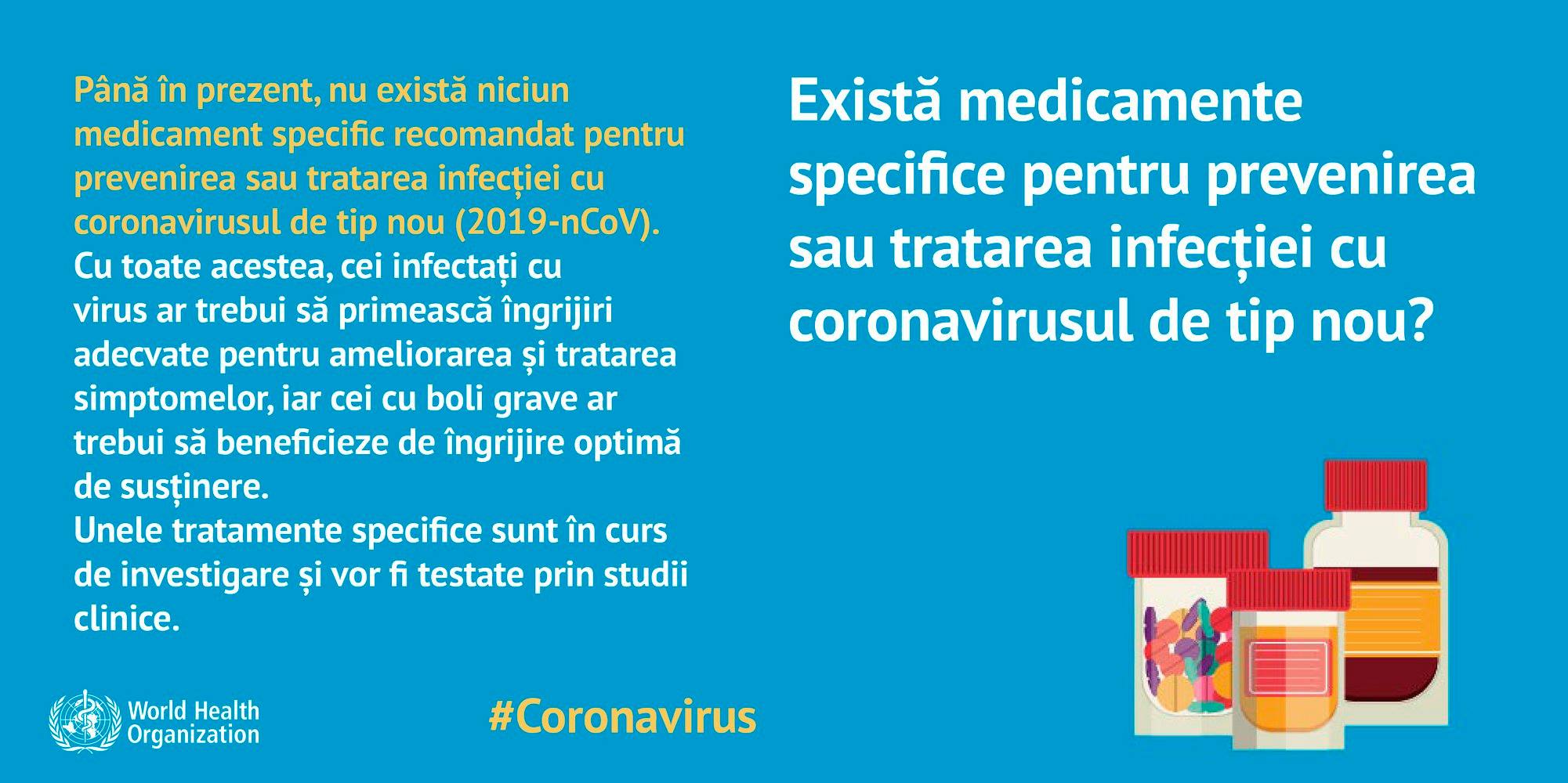 Există vreun medicament specific pentru prevenirea sau tratarea COVID-19 ? La zi, nu există medicamente specifice recomandate pentru prevenirea sau tratarea noului coronavirus. Totuși, cei infectați cu COVID-19 trebuie să primească îngrijire adecvată pentru ameliorarea și tratarea simptomelor, iar cei care suferă de afecțiune gravă trebuie să primească îngrijire de sprijin optimizată. Unele tratamente specifice se află în proces de cercetare și vor fi testate prin intermediul studiilor clinice intervenționale. OMS contribuie la coordonarea eforturilor pentru elaborarea medicamentelor pentru tratarea COVID-19 cu un șir de parteneri.