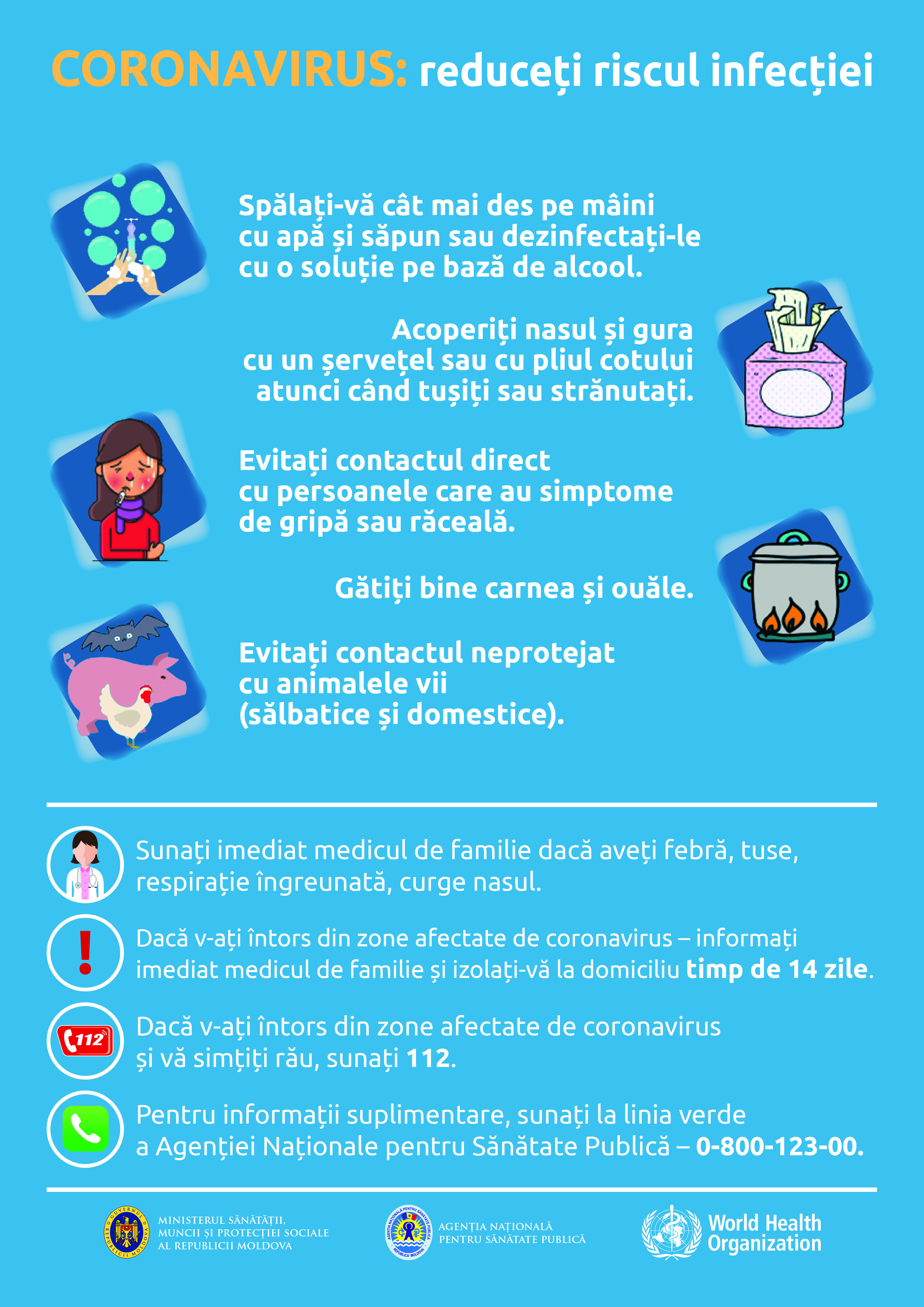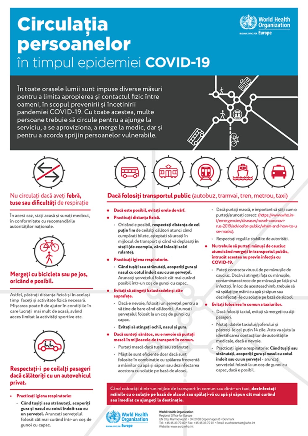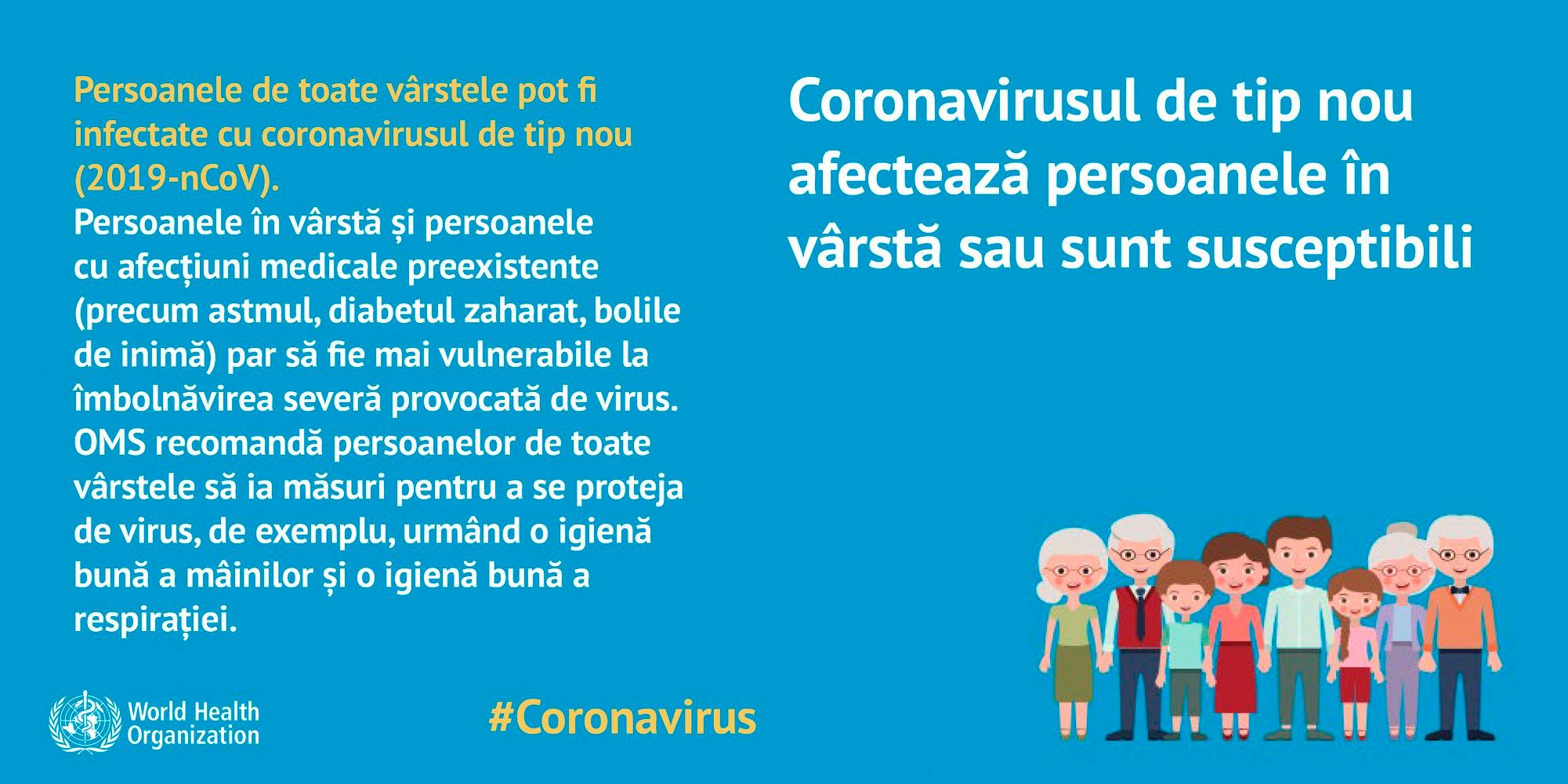 Cine se poate infecta cu acest virus? Persoanele care locuiesc sau călătoresc într-o zonă unde circulă virusul COVID-19 pot fi expuși riscului de infectare. Lucrătorii medicali care îngrijesc persoane care s-au îmbolnăvit de COVID-19 sunt expuși unui risc mai mare și trebuie să se protejeze prin proceduri adecvate de prevenire și control al infecției. OMS monitorizează în mod continuu epidemiologia acestui focar pentru a înțelege mai bine unde circulă virusul și cum oameni se pot proteja de infecție. Pentru mai multe informații, vezi situația cea mai recentă, oferită de OMS: aici