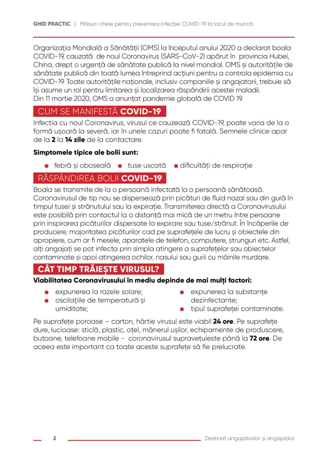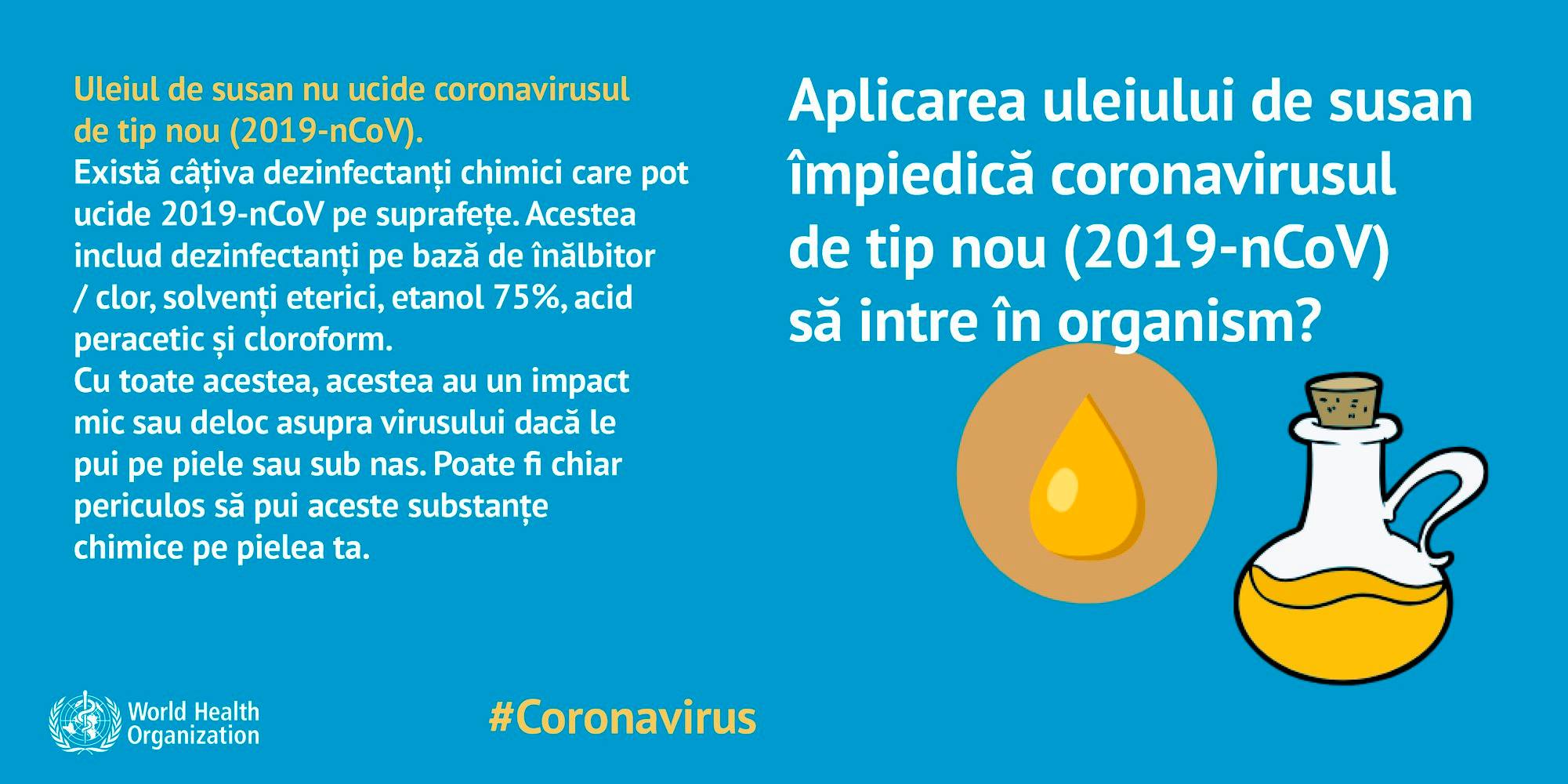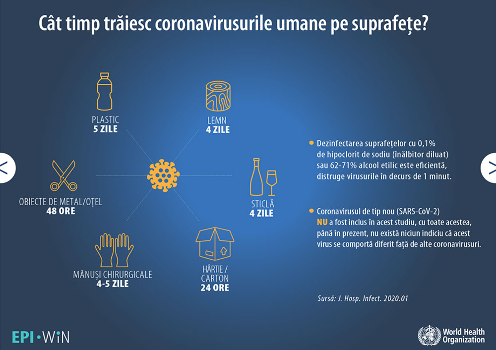 Cât de mult supraviețuiește virusul pe suprafețe? Încă nu se știe cât de mult virusul COVID-19 supraviețuiește pe suprafețe, deși informațiile preliminare sugerează că virusul poate supraviețui câteva ore. Aplicarea unor dezinfectanți simpli pot ucide virusul, astfel eliminând posibilitatea acestuia de a infecta în continuare persoanele.