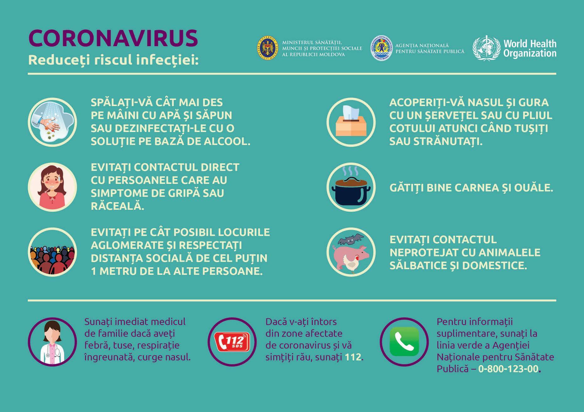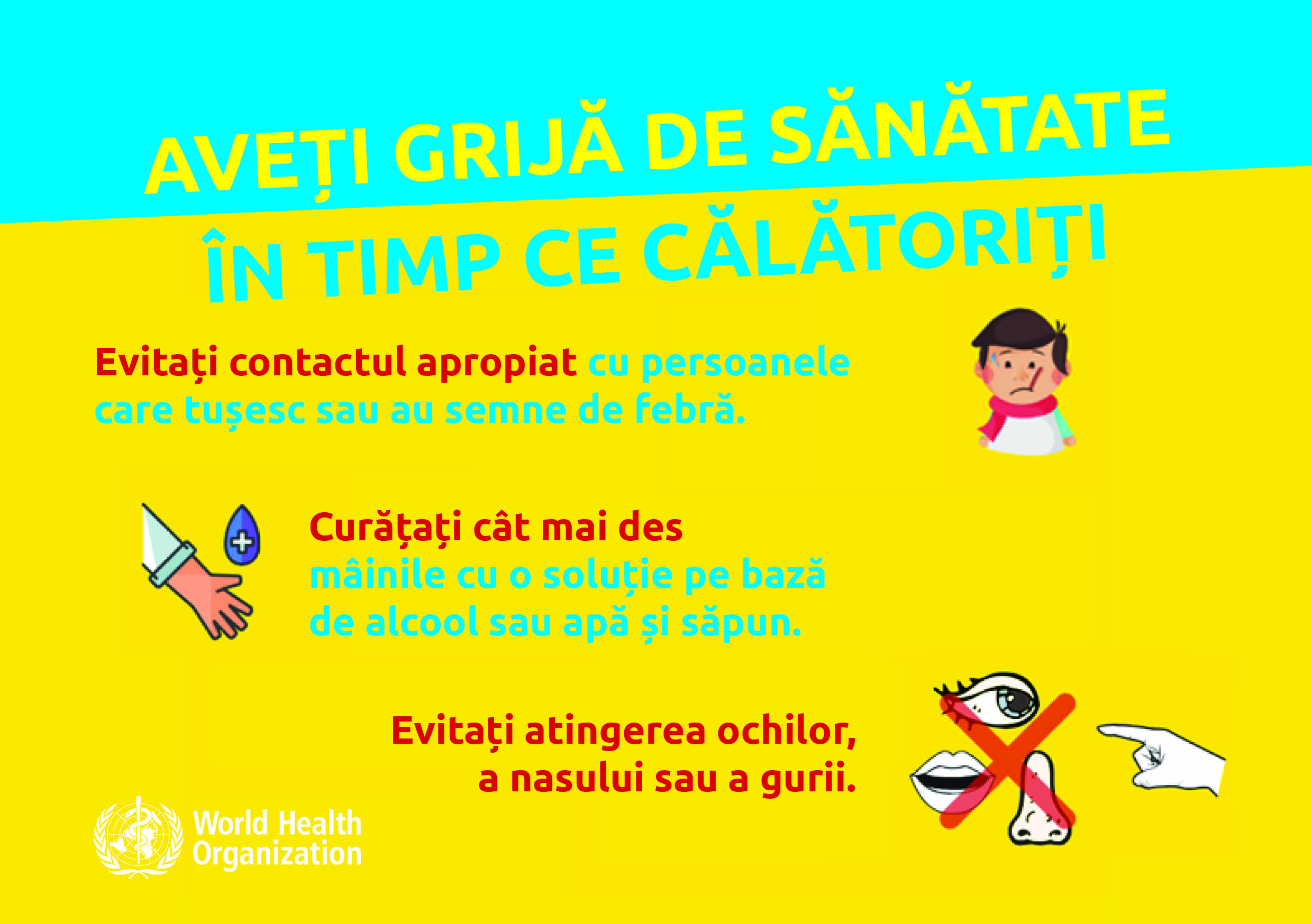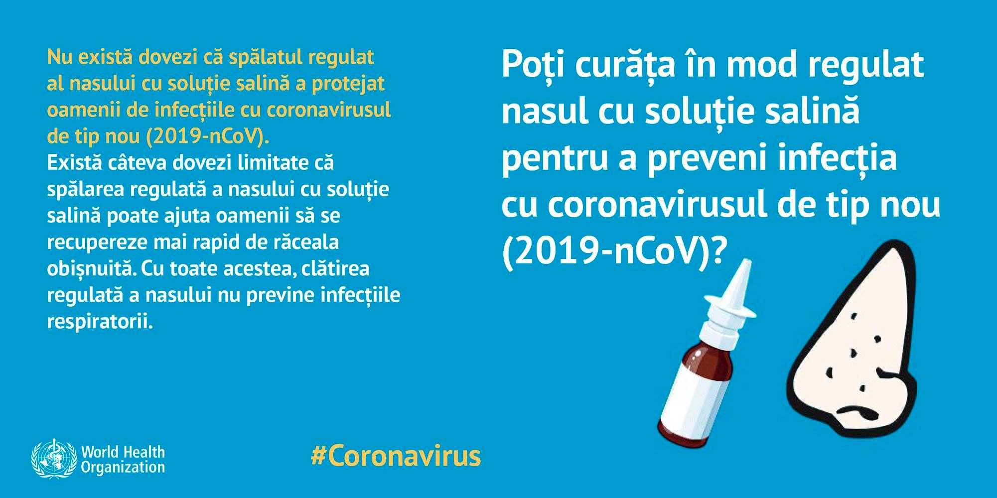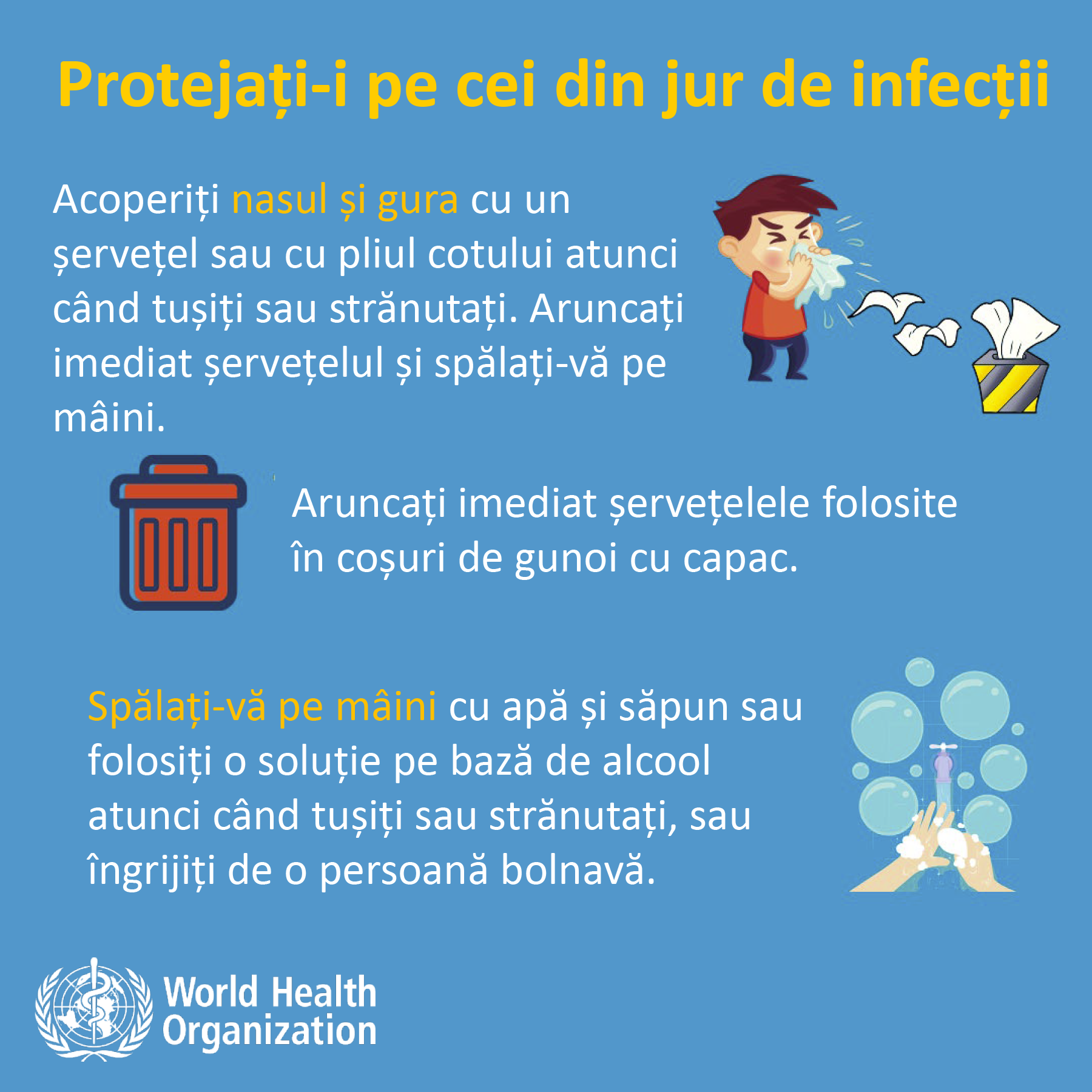 Cum se răspândește virusul? Noul coronavirus este un virus respirator care se răspândește în primul rând prin contactul cu o persoană infectată prin picăturile respiratorii generate atunci când persoana, de exemplu, tușește sau strănută, sau prin picături de salivă sau scurgeri nazale. Este important ca toți să practice o igienă respiratorie bună. De exemplu, strănută și tușește în cotul îndoit, sau folosește un șervețel și aruncă-l imediat într-o ladă de gunoi închisă. De asemenea, este important ca persoanele să-și spele mâinile regulat fie cu un produs de mâini, bazat pe alcool, fie cu săpun și apă.