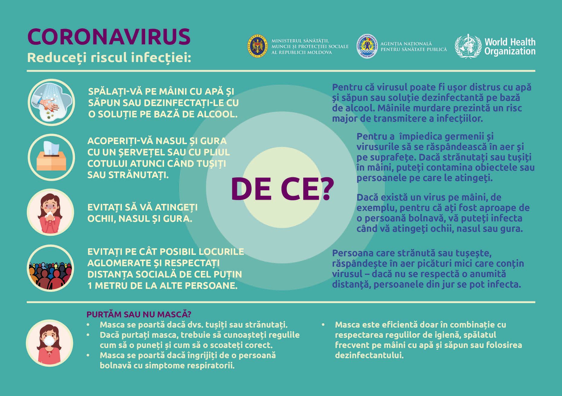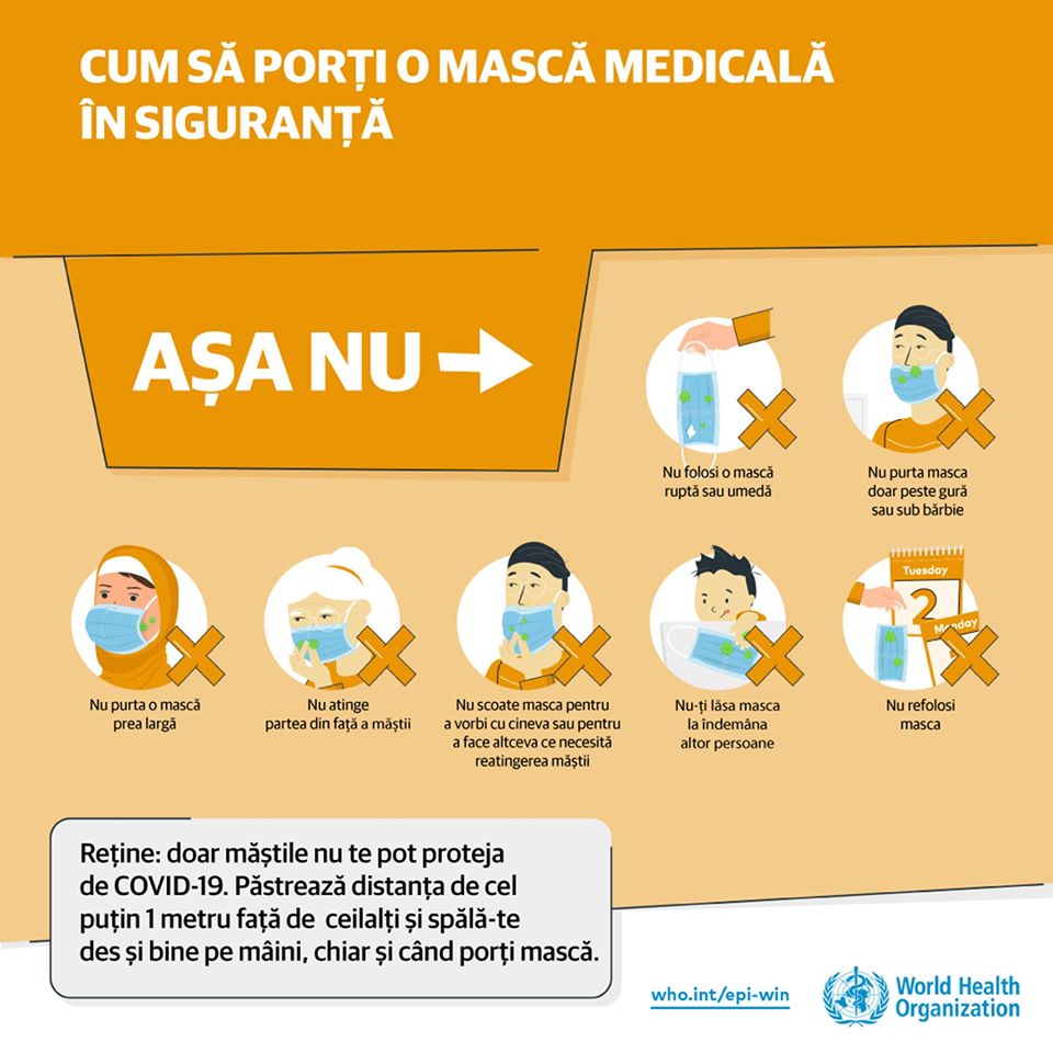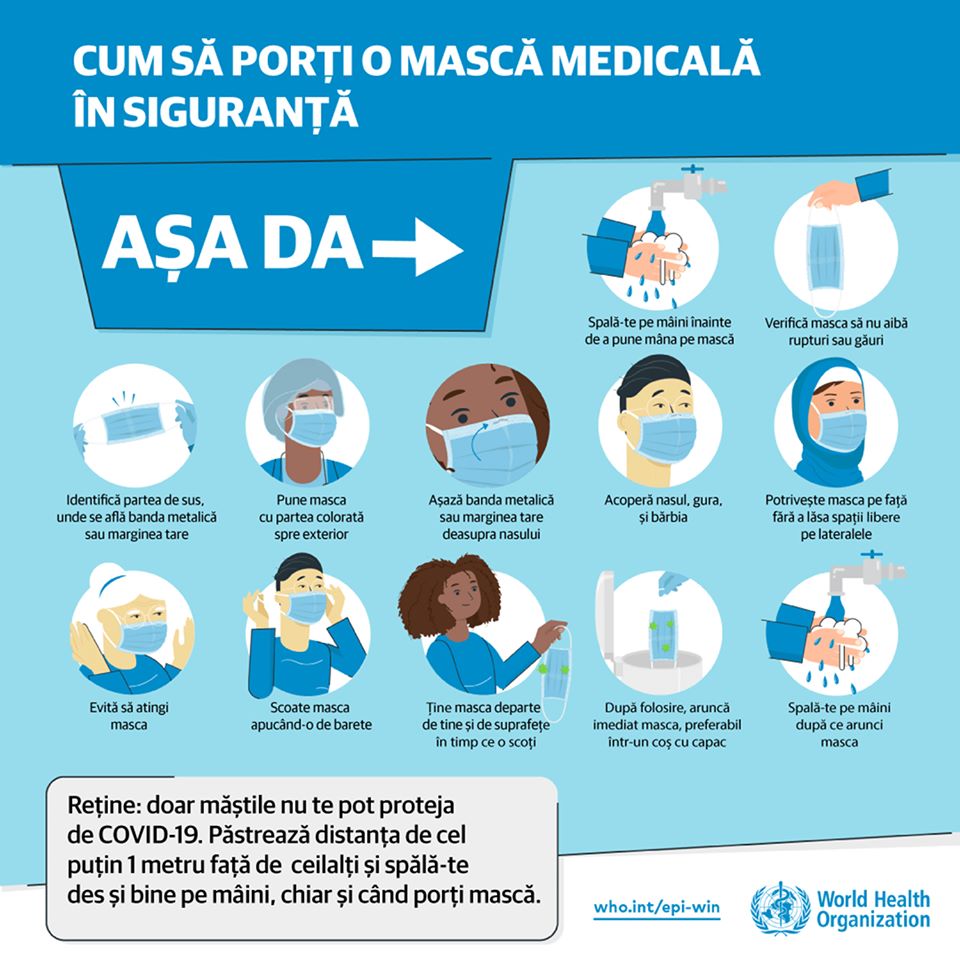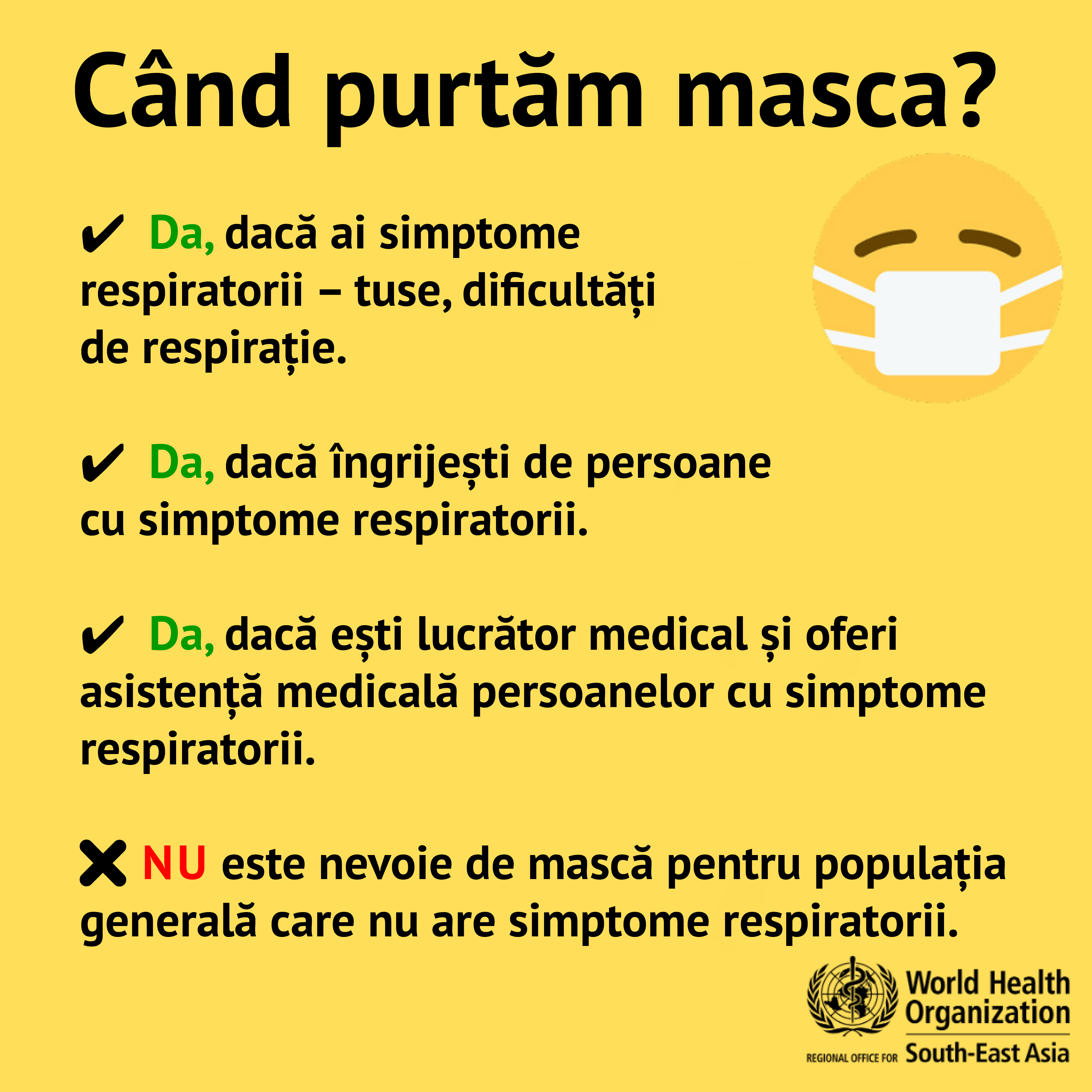 Să port mască ca să mă protejez? Purtatul unei măști medicale poate contribui la limitarea răspândirii unor boli respiratorii. Totuși, doar purtatul măștii nu este garantat că va stopa infecțiile și trebuie combinat cu alte măsuri de prevenție, inclusiv igiena de mâini și respiratorie și evitarea contactului strâns – cel puțin distanța de 1 metru între tine și alte persoane.