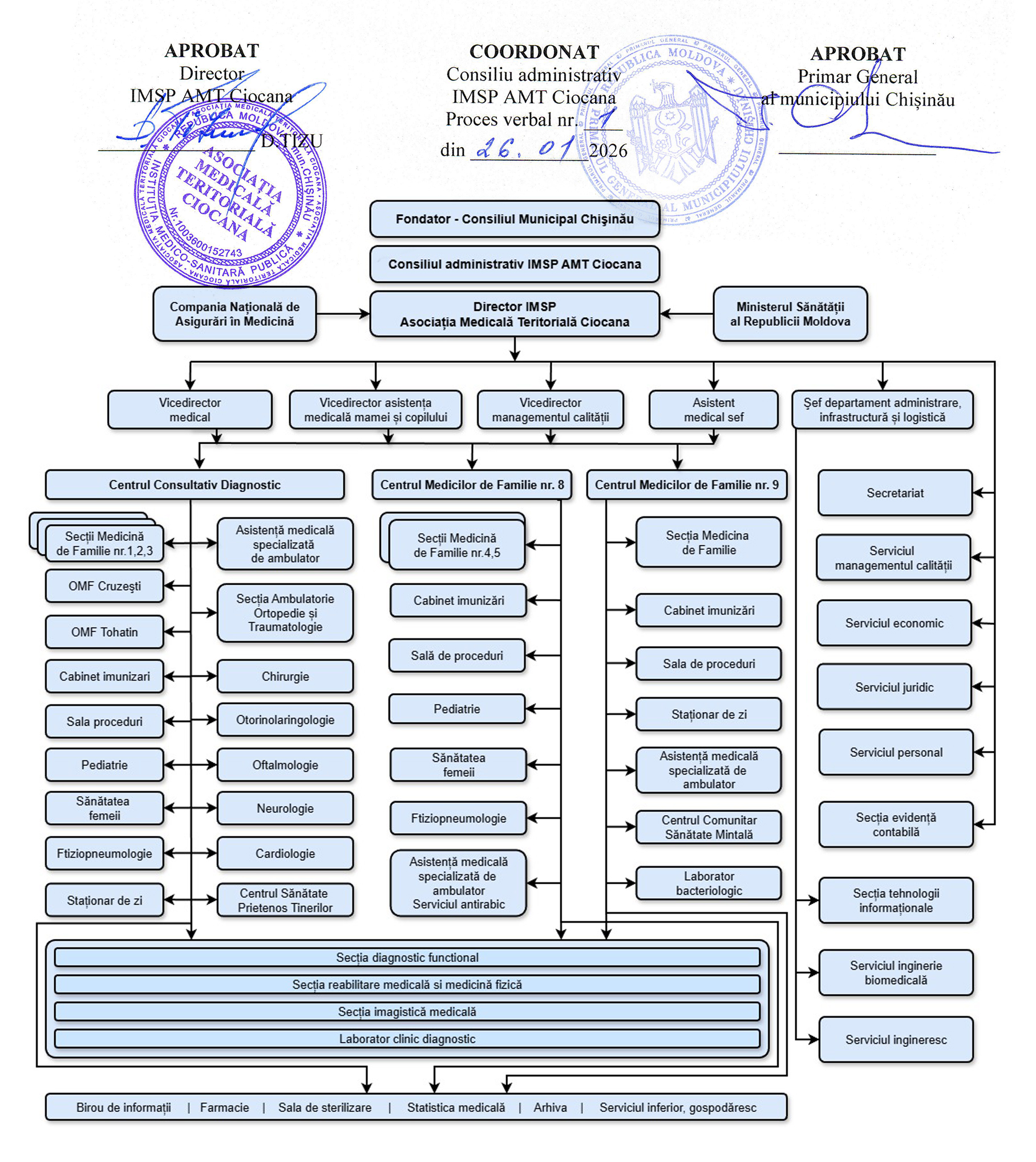 Fondatorul este organul de administrare al Instituţiei medico-sanitare publice şi îşi exercită drepturile de gestionar al Instituţiei medico-sanitare publice prin intermediul Consiliului administrativ şi directorului, conform Statutului. Directorul este persoana responsabilă şi abilitată cu dreptul de conducere a Instituţiei Medico-Sanitare Publice. IMSP AMT Ciocana include următoarele subdiviziuni: