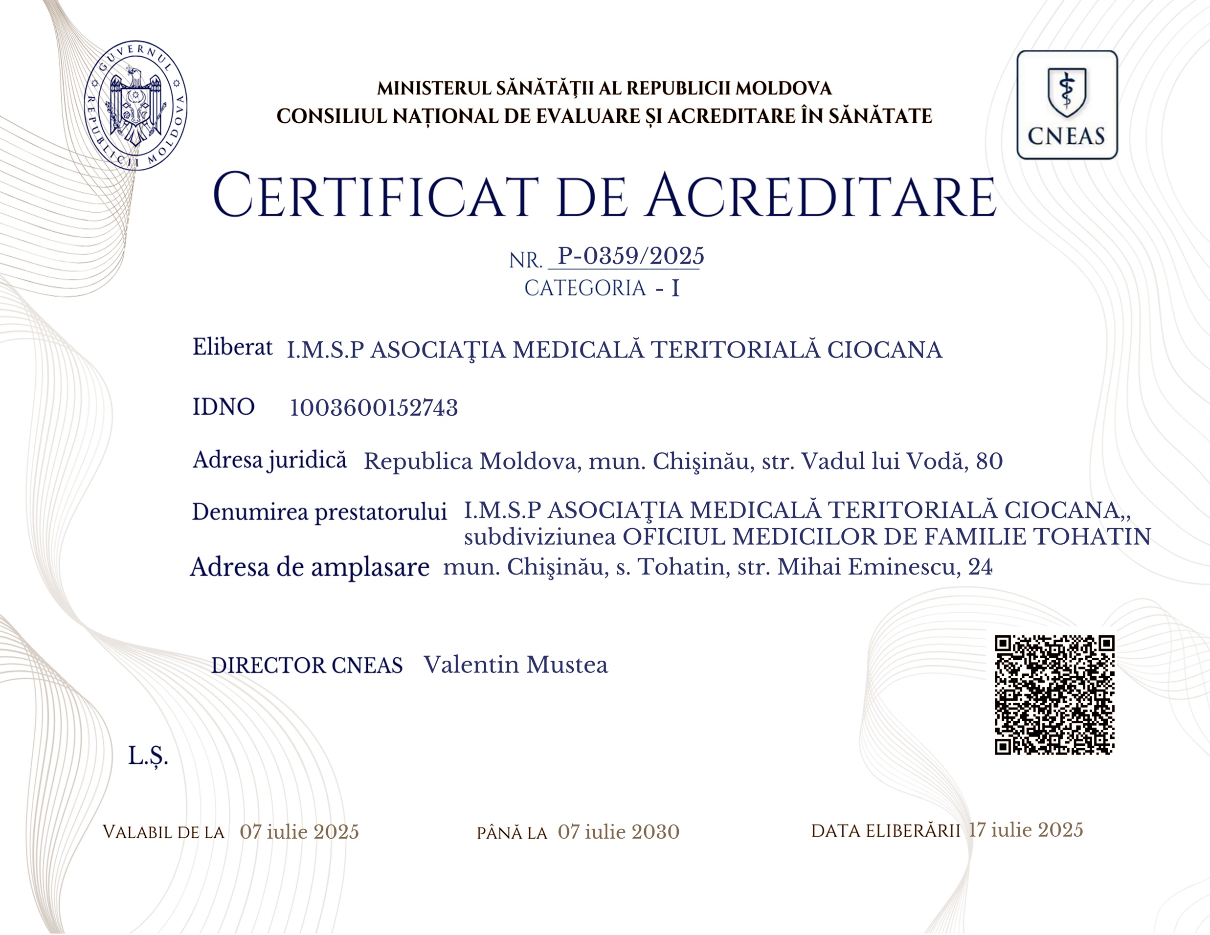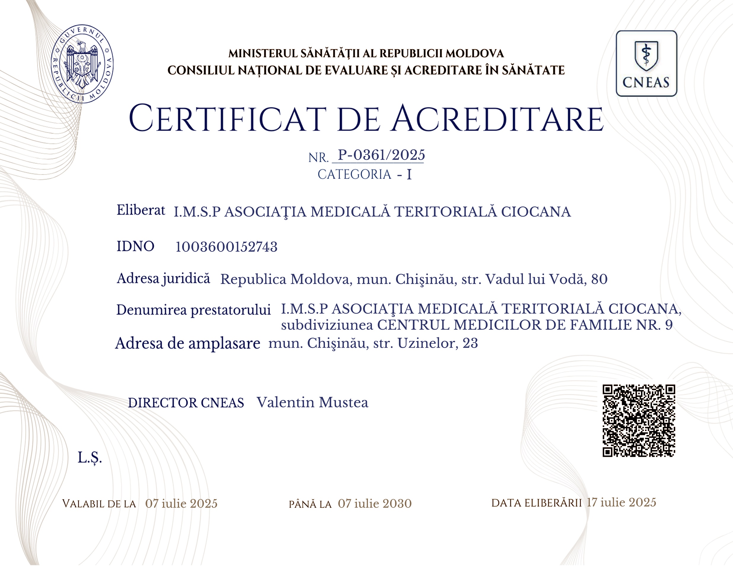 În conformitate cu Legea Republicii Moldova nr.552-XV din 18.10.2001 privind evaluarea şi acreditatarea in sănătate, la 30.06.2020, în cadrul IMSP Asociatia Medicala Teriotoriala Ciocana a avut loc procedura de evaluare și acreditare a instituției. Chiar și în situația epidemiologică actuală, cu respectarea tuturor rigorilor, experții Consiliului Național de Evaluare și Acreditare în Sănătate, au vizitat și evaluat toate subdiviziunile, fapt pentru care le aducem mulțumire, toată aprecierea și considerația noastră.